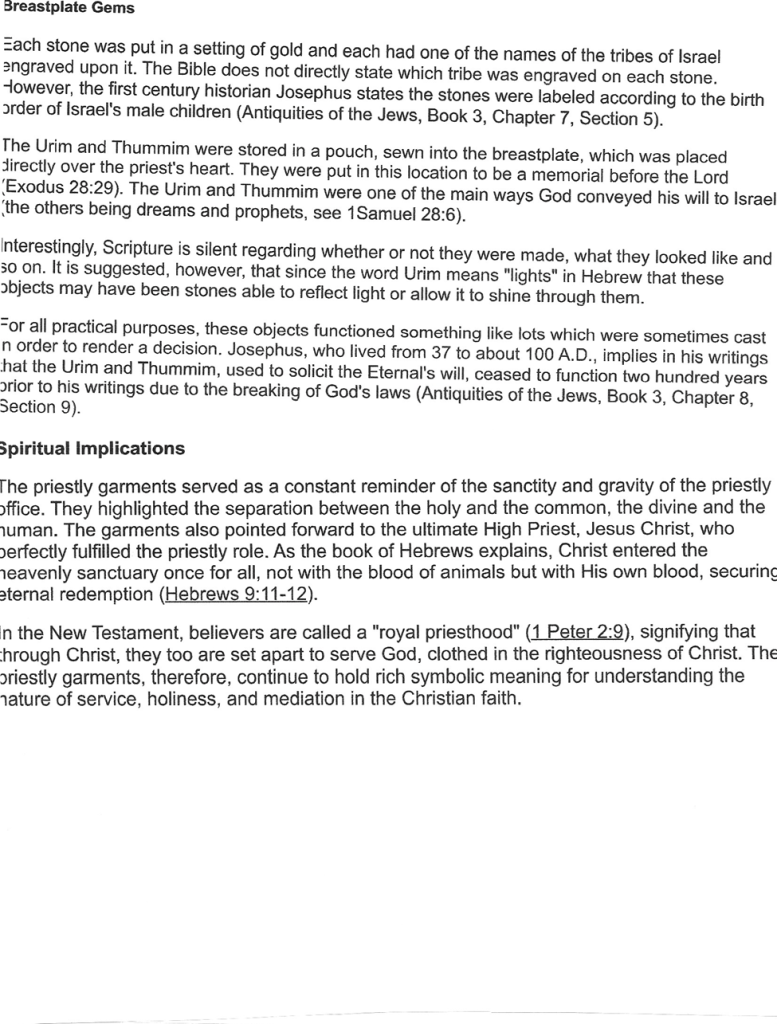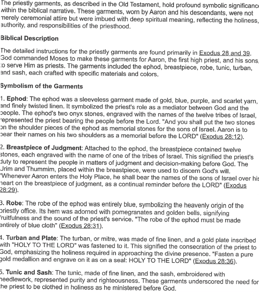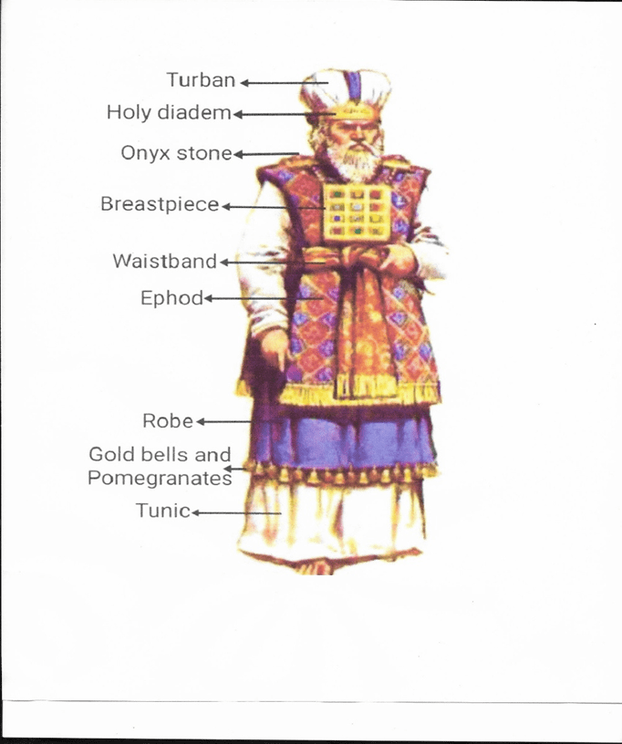 The first five books of the Bible are called the Pentateuch written by Moses. Today were focusing on the book of Exodus which records the happening of the Hebrew children leaving Egypt. When they got to Mount Sinai, God gave to Moses the law which included rituals, regulations, and worship stipulations. Among all of this writing God established a priesthood who would oversee and implement the various sacrifices and feasts for the people. The chief priest was Aaron, the brother of Moses, who was the spokesperson to Pharaoh because Moses stuttered. We’re going to examine the garments that Aaron was to wear in his new position. See attached a picture of what it might have looked like in those days and additional explanation.